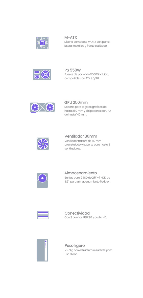 | Fuente de alimentación | Compatible con fuentes ATX 2.0/3.0 (Incluye Fuente de Poder de 550W) |