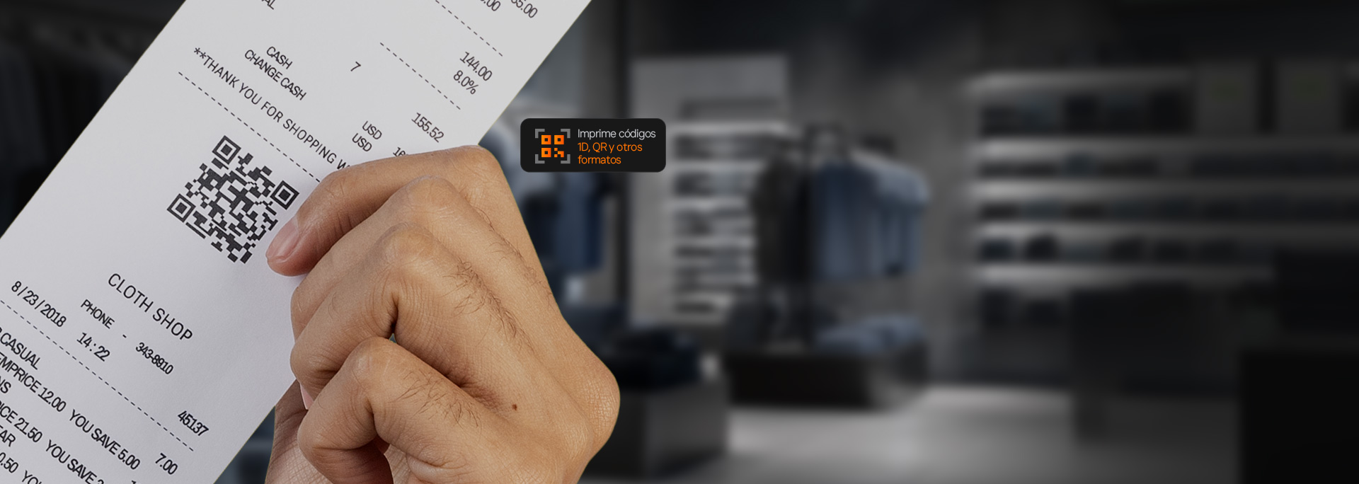 Imprime códigos 1D, QR y otros formatos, y es compatible con comandos EPSON ESC/POS, lo que facilita su uso en retail, restaurantes y logística.