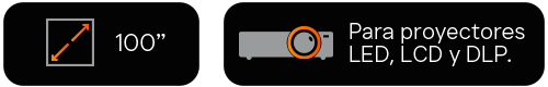 100 pulgadas, tamaño de visión en diagonal: 254 ± 0.5cm. Adecuado para proyectores LED, LCD y DLP.